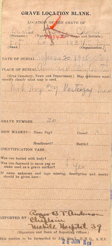 Practically, this meant the Army saw the notification of family members as its responsibility. Telegrams abound from the Great War that notified families of soldier casualties (See Figure 1). Chaplains seemed to play two key roles in this process: first, they often took it upon themselves to personally write to families when soldiers under their spiritual care died in combat (See Figure 2). Second, when chaplains were present for funerals/burials, they acted as reporting officers for a form entitled “Grave Location.” These forms were filled out, when possible, by the chaplain as the officer-in-charge for marking grave locations, information which was then passed onto the family (See Figure 3). The legacy Chaplain Pierce imbued on the GRS was most likely the impetus for the Corps’ charge to, “Honor the Fallen.” Historian Kyle Hatzsinger says in his PhD Dissertation, “Democracy of Death”: